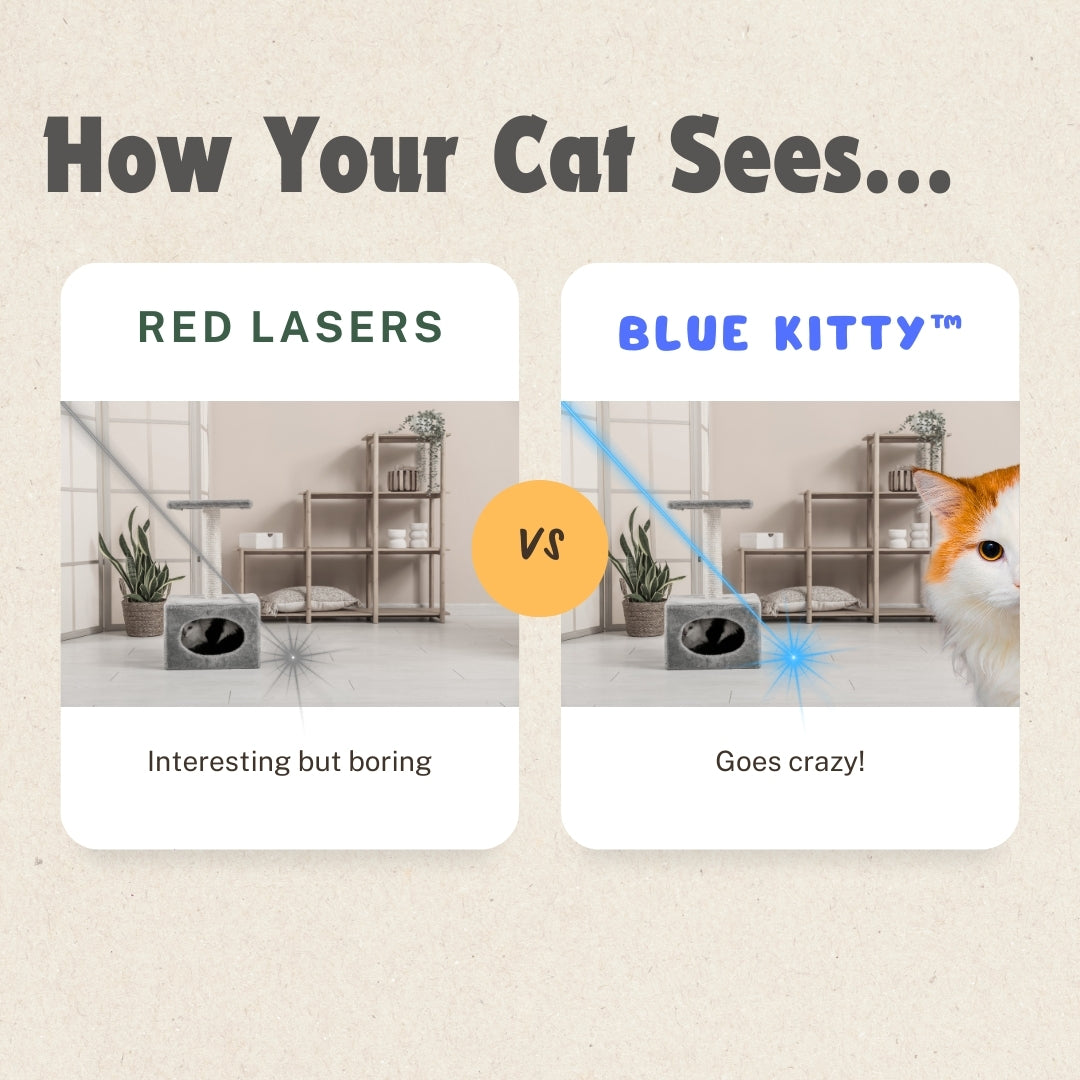 Your cat perceives red as just another shade of grey—it’s exciting because it moves. However, Blue Kitty™ is scientifically proven laser to stand out, driving them wild as they mistake it for easy prey.