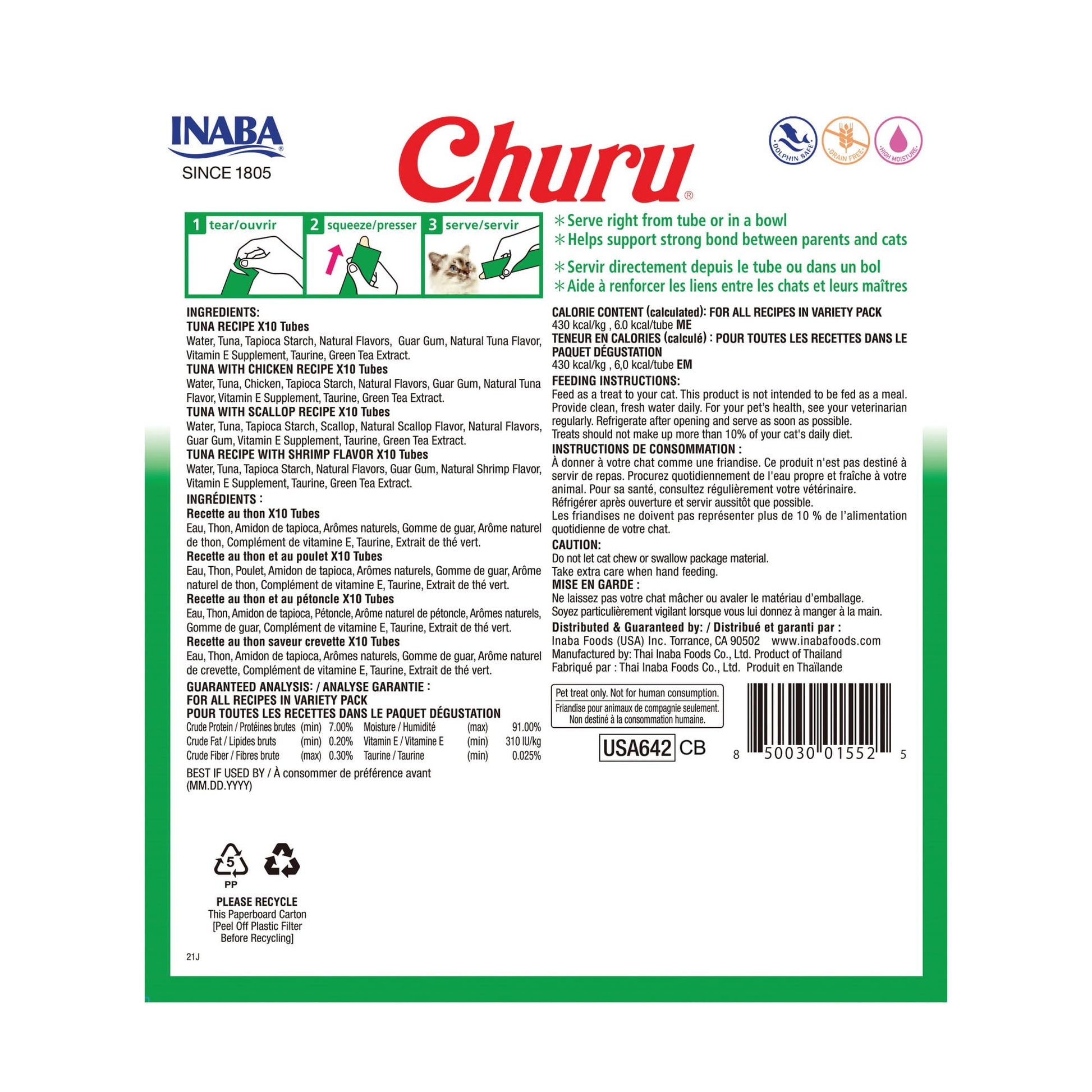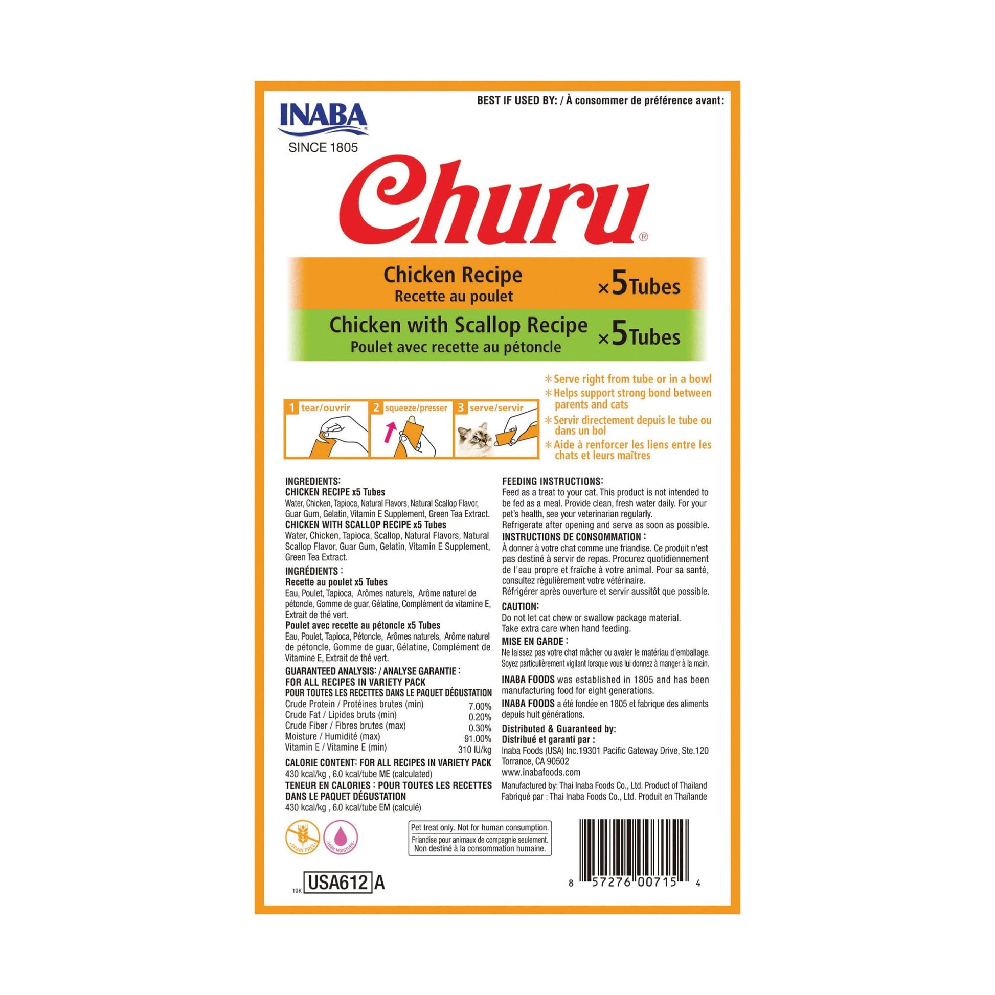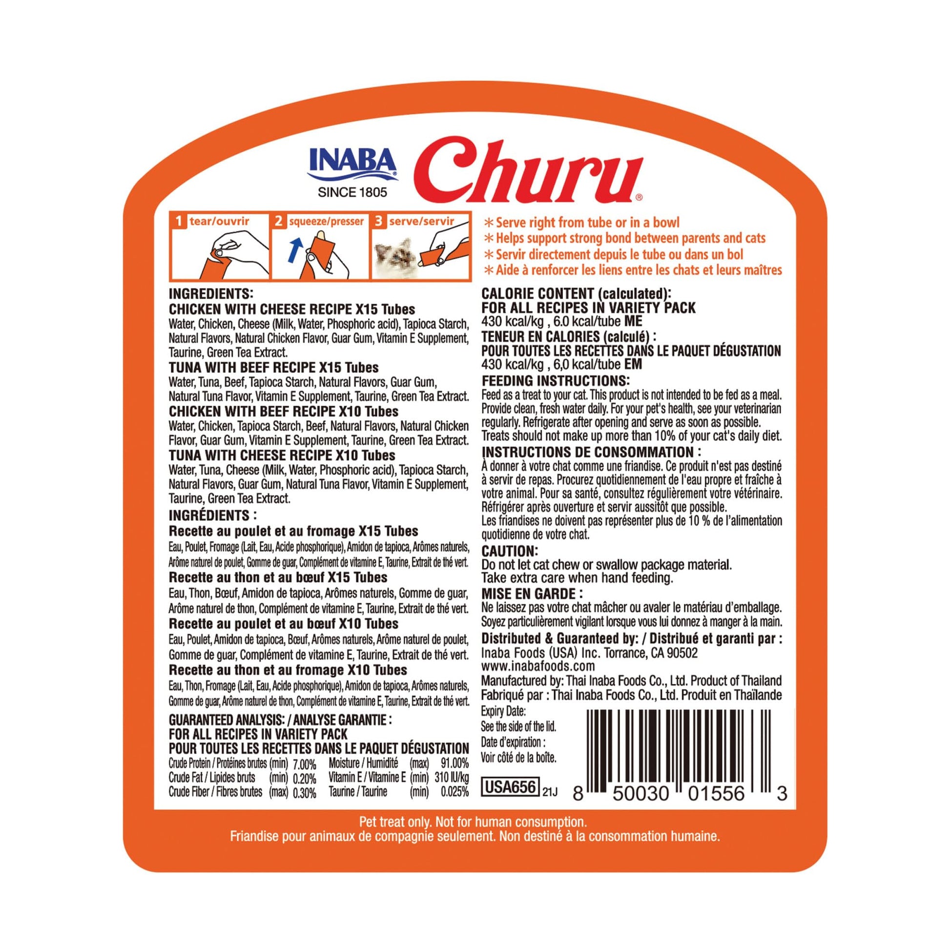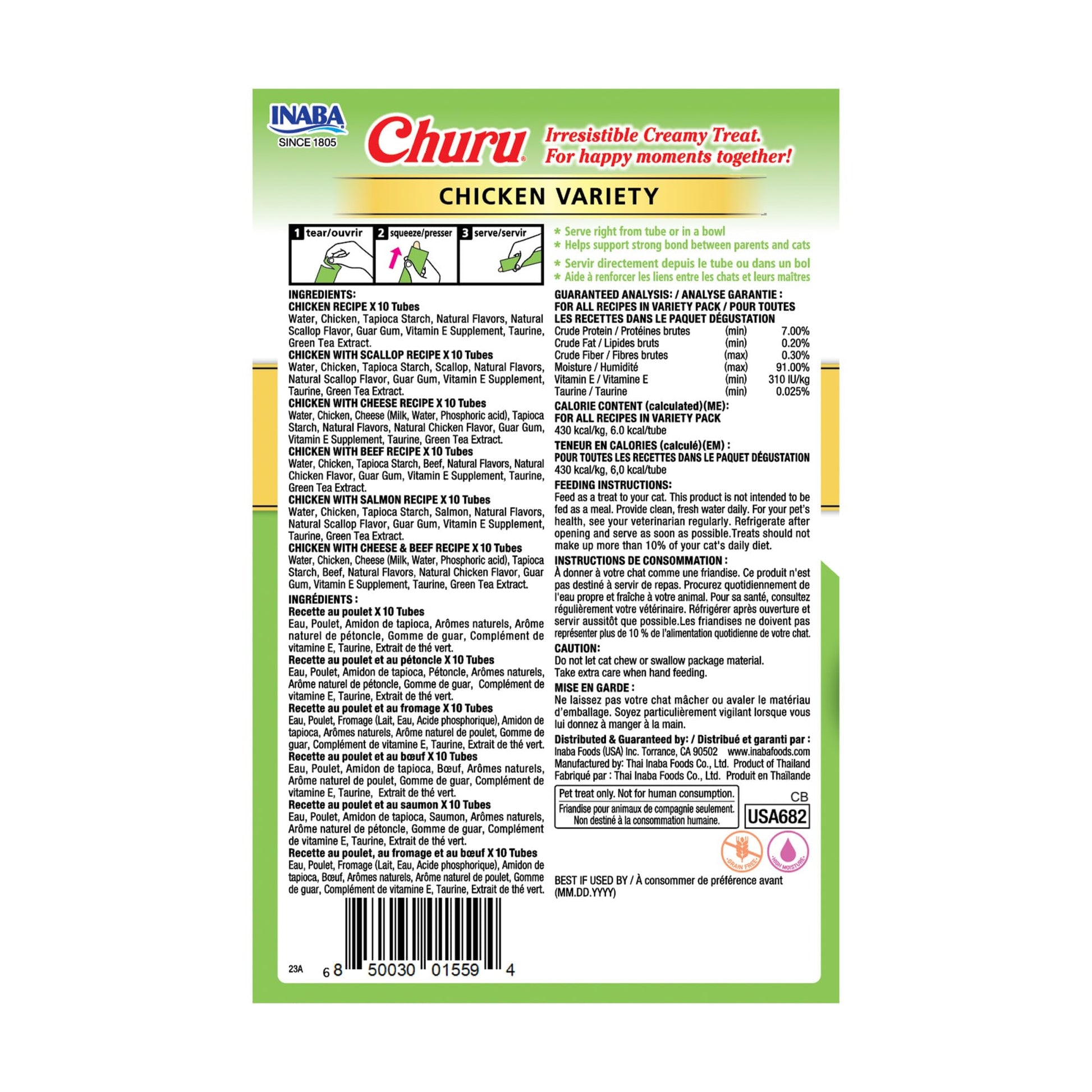 INABA Churu Cat Treats, Grain-Free, Lickable, Squeezable Creamy Purée Cat Treat/Topper with Vitamin E & Taurine, 0.5 Ounces Each Tube, 50 Tubes, Tuna & Chicken Variety